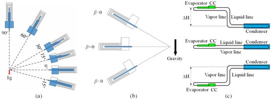 - Wang, H.; Lin, G.; Shen, X.; Bai, L.; Wen, D. Effect of evaporator tilt on a loop heat pipe with non-condensable gas. Int. J. Heat Mass Transf. 2019, 128, 1072–1080. [Google Scholar] [CrossRef]