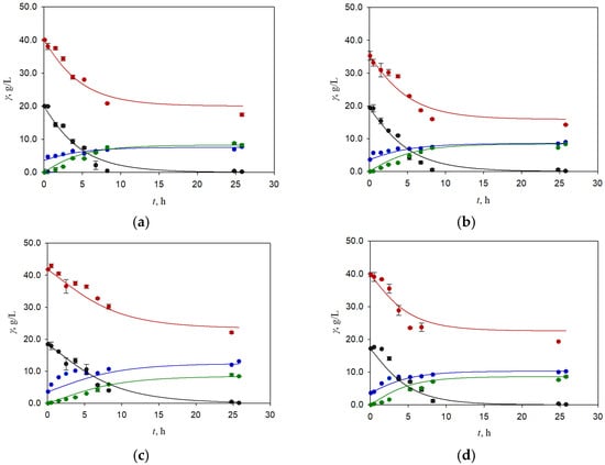 Dynamic change in the concentration of microbial biomass (●), bioethanol (●), glucose (●) and total sugars (●) for the acid hydrolysate of BSG treated with (a) NaOH, (b) activated charcoal and NaOH, (c) Ca(OH)2, (d) activated charcoal and Ca(OH)2 ((-) mathematical model of the process).