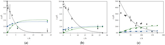 To better understand the process, a mathematical model was proposed to describe the dynamics of the process. Three independent experiments were proposed, in which the influence of the initial glucose concentration on bioethanol production was monitored (Figure 3).