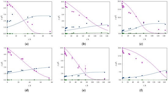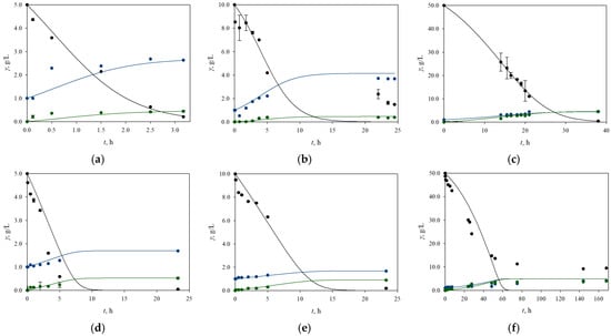 Changes in the concentrations of glucose (●), bioethanol (●) and microbial biomass (●) described using a mathematical model (-) during the fermentation process by K. marxianus (a–c) and C. krusei (d–f) yeast for different initial glucose concentrations: (a) 5 g/L, (b) 10 g/L, (c) 50 g/L, (d) 5 g/L, (e) 10 g/L, (f) 50 g/L.