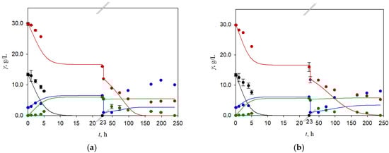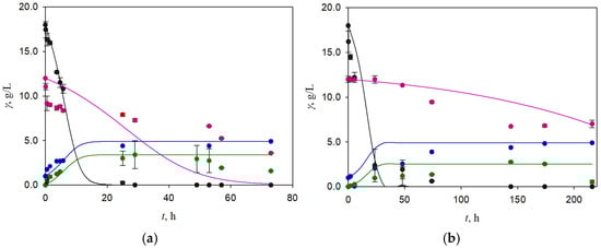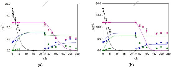 Changes in the concentrations of glucose (●), total sugars (●), bioethanol (●) and microbial biomass (●) described using a mathematical model (-) during the process of two-stage fermentation of acidic hydrolysate of BSG with the yeasts (a) S. cerevisiae and K. marxianus and (b) S. cerevisiae and C. krusei.