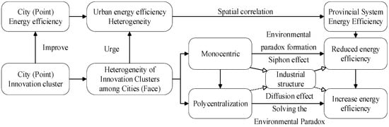 Innovation agglomeration is the key breakthrough point to achieve high-quality economic development, and the effective agglomeration of innovation elements is the necessary condition to achieve innovation-driven development. In today’s era of globalization and rapid technological development, innovation has become a core factor driving economic growth. The phenomenon of innovation agglomeration, that is, the high concentration of innovation activities in a specific region, has become a new focus of global economic competition. Innovation agglomeration refers to the phenomenon that innovation activities, innovation resources and innovation subjects are highly concentrated in a specific geographical area or field. Such agglomeration can bring about a range of economic and social effects, including but not limited to knowledge spillover, talent exchange, technological progress, and industrial upgrading. Innovation agglomeration is the key driving force of modern economic development. It accelerates the generation and application of new ideas and technologies by promoting knowledge sharing, technology exchange and talent flow. Within the provincial system, the urban unit serves both as a locale for innovative activities and a spatial agent for the enhancement of energy efficiency. However, under the condition of spatial heterogeneity, substantial disparities exist in innovation activities among different urban units, and they are manifested through the monocentricity or polycentricity of the spatial structure. The monocentric spatial structure resembles the rigid vertical structure of hierarchical differentiation and frequently presents a spatial structure of “strong provincial capital” or “one city dominance.” Nevertheless, the polycentric spatial structure leans towards the “flattening” of urban scale distribution []. However, it is unclear which kind of innovation agglomeration spatial structure brings about the improvement in energy efficiency in provincial systems. Our prediction is that a polycentric spatial structure will bring about such effects []. This structure represents continuous interaction and cooperation between urban units and is also an advanced way for each urban unit to achieve regional innovation through the mode of “cooperation in competition and competition in cooperation” within the spatial scope. Overall, there is a spatial correlation between energy efficiency and spatial scale, but different spatial structures of innovation agglomeration have varying impacts on the energy efficiency of provincial systems (Figure 1).