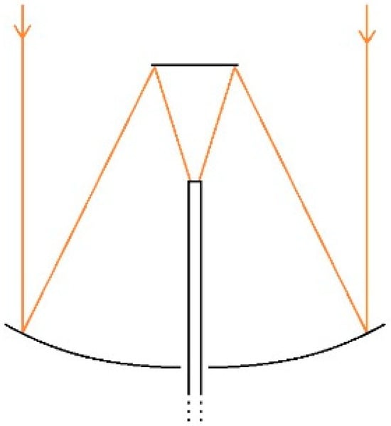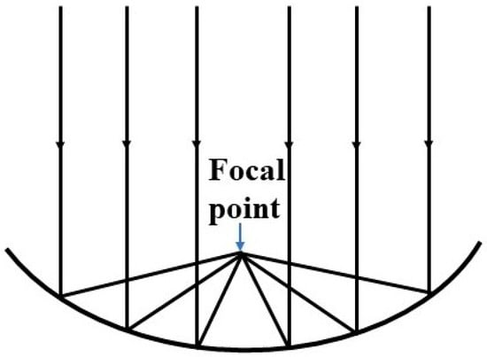 A solar concentrator is a device that collects solar radiation and focuses it on a smaller area to get higher irradiance power. The device is mainly comprised of a mirror or a lens or a series of lenses or mirror assembly, a receiver, and the tracking system. A paraboloid mirror and Fresnel lens are generally used to design a solar concentrator. The paraboloid mirror reflects the sunlight and concentrates at the focal point of the mirror as shown in Figure 1. The Australian National University has worked for many years on paraboloid dish solar concentrators, and they built a 500 m2 concentrator to convert solar energy into electricity, which is presented in Figure 2 [15]. Many researchers have developed similar kinds of solar concentrators to generate electricity from sunlight. These works have been summarized and described by Baharoon et al. [16] in their review article. Sometimes, a paraboloid cavity mirror is used with another secondary mirror to deliver concentrated sunlight through the cavity of the paraboloid mirror. The working principle of this kind of system is illustrated by ray diagram in Figure 3. The primary mirror (paraboloid cavity mirror) gathers and focuses sunlight onto a secondary mirror (flat mirror). This secondary mirror redirects and intensifies the sunlight onto a receiver or target. We have pioneered the development of such a solar concentrator, which we have coupled with an optical fiber bundle, known as ECoSEnDS (extremely concentrated solar energy delivery system) [8].