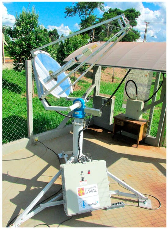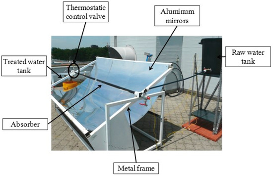 In the last few decades, many efforts have been made to develop efficient systems for wastewater purification processing using solar concentrators. Bigoni et al. [20] developed a solar pasteurizer using a parabolic trough concentrator for water purification. The developed system is shown in Figure 9. The sunlight is reflected by a parabolic mirror made with aluminum onto a black steel pipe, serving as the absorber, precisely positioned along the mirror’s focal line. The absorber, measuring 3 m in length with an internal diameter of 3.8 cm and a volume of 3.4 L, effectively captures the concentrated solar energy. They used three pieces of 100 by 200 cm highly reflective sheets to make parabolic reflector. As untreated water flows through the pipe, it undergoes heating from the concentrated solar radiation, reaching pasteurization temperatures. Using this device, Bigoni et al. [20] were able to collect 66 L of treated water in a sunny day. They mainly studied the pathogens removal from the water.
