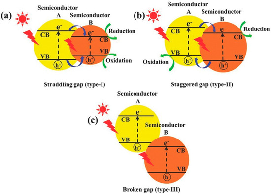 Schematic depiction of three distinct heterojunction photocatalyst types: (a) type-I, (b) type-II, and (c) type-III heterojunctions (Reprinted with permission from Ref. [52]. 2014, Royal Society of Chemistry).
