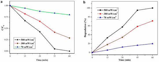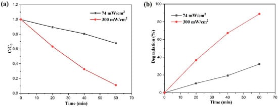 Our team further investigated the photocatalytic degradation of MB dye utilizing BiVO4 nanoflakes, employing an advanced solar concentrator coupled with an optical fiber bundle. Interestingly, our findings mirrored those previously mentioned. As depicted in Figure 14, we observed degradation efficiencies of 88.86% and 32.30% after 60 min of sunlight irradiation at intensities of 300 and 74 mW/cm2, respectively [5]. This underscores the enhanced photocatalytic activity of BiVO4 nanoflakes under increased sunlight irradiation intensity.