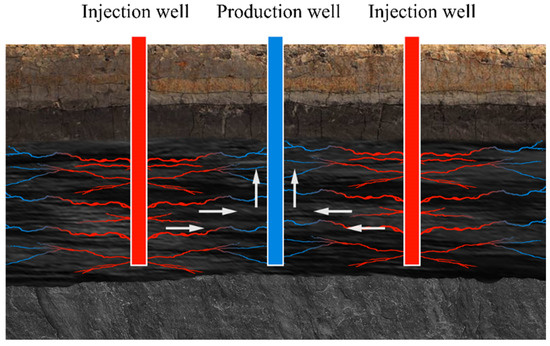 Currently, in situ pyrolysis technology for oil shale is considered the sole viable method for large-scale industrial extraction owing to its high heating efficiency and the advantage of not being constrained by the thickness and burial depth of the target reservoir [3,8,9]. The Modified Thermal Injection (MTI) technique, proposed by the Taiyuan University of Technology (Figure 1), stands out as a notable approach to the in situ pyrolysis of oil shale. This technique employs hydraulic fracturing to transform the oil-shale reservoir; this step is followed by heating of the mineral body using high-temperature steam (above 550 °C) as the heat carrier. The resultant oil and gas products from the pyrolysis process are then transported through the fluid to the production well, completing the in situ pyrolysis of oil shale. When utilizing convective heating for in situ pyrolysis of oil shale, a crucial consideration arises: given the typical anisotropic characteristics of oil shale’s thermal conductivity [10], variations in internal temperature distribution are inevitable as the formation’s temperature steadily increases. Under the coupled influence of thermal cracking and pyrolysis, the internal pore−fracture structure, mechanical strength, and deformation characteristics of the oil shale will undergo changes, subsequently impacting the aperture, the connectivity of the fracture network, and even the efficiency of pyrolysis [11,12]. Therefore, a comprehensive study of the microstructural and macroscopic mechanical properties of oil shale along different bedding directions under high-temperature conditions is necessary to ensure the successful implementation of in situ pyrolysis technology for oil shale.