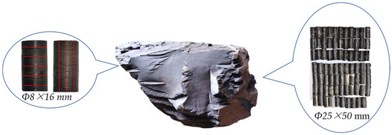 To minimize variability among specimens, all samples were taken from the same large block of oil shale (Figure 2). In the process of specimen processing, in order to eliminate the influence of drill torque on the bedding surface of oil shale, a carborundum saw cutting machine was used for sample processing. Upon completion of specimen processing, an ultrasonic testing analyzer was employed to rigorously screen the samples. The selected samples were sealed with paraffin wax to effectively prevent oxidation, so as to ensure the accuracy of the experimental results. The specifications for each experimental sample were as follows: (1) cylindrical oil-shale samples measuring Φ8 × 16 mm, employed for CT observations of the microstructure of oil shale under thermal−mechanical coupling; (2) cylindrical samples with dimensions of Φ25 × 50 mm, used for high-temperature real-time uniaxial-compression experiments on oil shale.