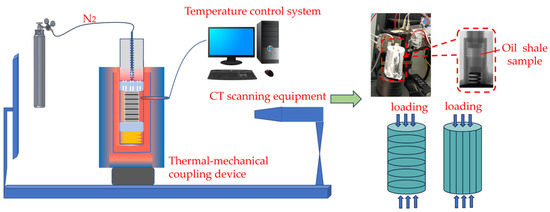 Before the experiment, Φ8 × 16 mm oil shale specimens were placed in the loading device and subjected to an axial stress of 2 MPa perpendicular to the bedding plane. Subsequently, the CT equipment was employed to scan and record the initial development state of pores and fractures within the specimens. After the scanning process was complete, the heating device was used to increase the temperature at a rate of 0.5 °C/min, sequentially reaching 100 °C, 200 °C, 300 °C, 400 °C, 500 °C, and 600 °C. Simultaneously, N2 gas was introduced to prevent the combustion of the oil shale. Once the target temperature was reached, the specimens were maintained at a constant temperature for 2 h to satisfy the overall temperature balance within the rock [35]. Following this, CT scanning was performed to document the characteristics of the evolution of pores and fractures within the oil shale at that specific temperature. This methodology was then replicated for the CT scanning of specimens oriented parallel to the laminations.