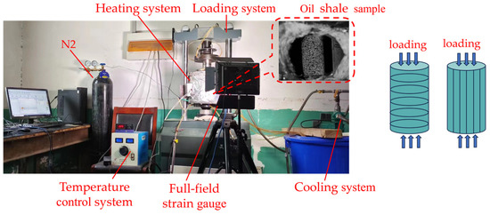 The evaluation of mechanical properties in oil shale under real-time conditions was performed using the high-temperature rock-mechanics testing system developed by the Taiyuan University of Technology (Figure 4). The loading system boosted a maximum load capacity of 200 kN and a displacement resolution of 0.048 µm. The heating system employed radiation heating and could attain a maximum temperature of 800 °C, ensuring a temperature-control accuracy of ±0.1 °C [35]. For deformation monitoring, a MatchID-2D/Stereo full-field displacement, strain-measurement, and simulation-optimization analysis system was used, featuring a surface resolution of 0.02195 mm/pixel and a displacement accuracy of 0.01 pixels.