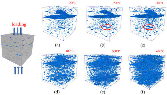 Rendering the distribution characteristics of internal pores and fractures in oil shale under loading along parallel bedding planes; (a–f) show the distribution characteristics of the pores and fractures of oil shale at different temperatures.