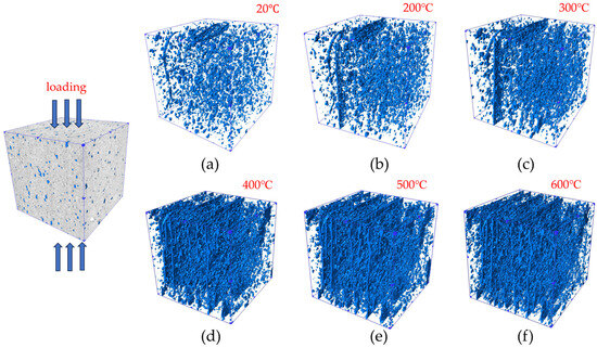 Rendering the distribution characteristics of internal pores and fractures in oil shale under loading along perpendicular bedding planes; (a–f) show the distribution characteristics if the pores and fractures of oil shale at different temperatures.