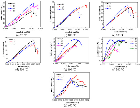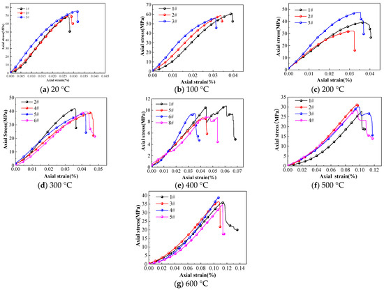 Stress−strain curves of perpendicular oil-shale bedding under different temperature conditions.
