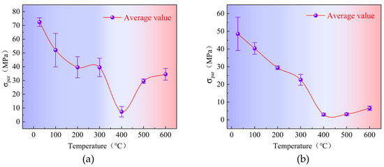 Stage 2: In the temperature range of 400–600 °C, σpar gradually increased as the temperature rises. This result is contrary to that obtained after high-temperature treatment [45]. At 600 °C, σpar reached 6.5 MPa, which was 13.4% of its value at room temperature. This increase occurred because when the parallel bedding is loaded, the primary reason for the oil shale’s loss of bearing capacity is the tensile failure caused by lateral-component stress. However, when the temperature reached 400 °C, further heating had minimal effects on bedding cracks (Figure 6d–f). At this point, the increase in matrix strength due to changes in the mineralogical composition was the primary reason for the increase in σpar.