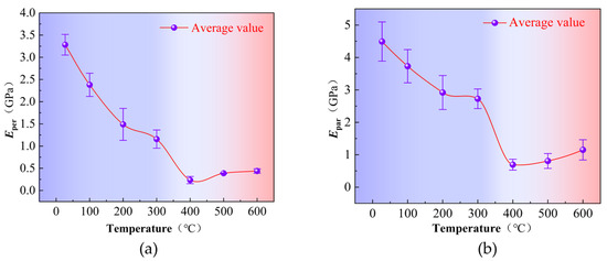 As per Figure 10a,b, it is evident that within the range from room temperature to 600 °C, the elastic modulus in the vertical bedding-plane direction (Eper) and the elastic modulus in the parallel bedding-plane direction (Epar) undergo two distinct stages of change with increasing temperature.