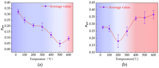 Variation in Poisson’s ratio of oil shale with temperature under high-temperature real-time conditions: (a) loading perpendicular to the stratification; (b) loading parallel to the stratification.
