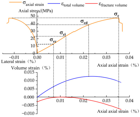 The fracture damage stress threshold, σcd, signifies the initiation of unstable expansion of internal fractures. As the load continues to increase, it leads to a transition from linear to nonlinear stress−strain curves, indicating an imminent failure of the rock [51].