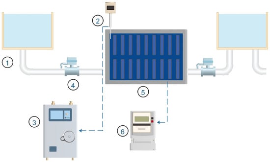 Test system components: 1—tank, 2—thermocouples, 3—data logger, 4—selinode valve, 5—solar cells with water duct, and 6—multimeter.