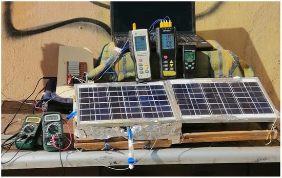 The system consists of two identical PV cells to facilitate a clear comparison. The type of cell is mono-crystalline. The nominal power of each cell is 10 watts, while its dimension is 345 × 255 × 18 mm3. One of the solar cells is cooled using water, while the other is not cooled. The saltwater comes from a well using a feed pump. Then, that water is used to cool down the solar cell. Heat is transferred from the solar cell to salt water. The membranes remove the salt from the water to produce freshwater. Two solenoid valves that regulate the water flow prior to and subsequent to the solar cell make up the cooling system. The temperature of the water determines when the solenoid valves open and close. Water is transferred from the tank to a duct located at the base of the solar cell via a pipe that has a solenoid valve in it. Through a pipe, the cooling water is transferred to a different tank where the other solenoid valve is located. The RO system receives its supply of cooling water from the other tank. Since the solenoid valve opens and closes at a predetermined temperature that varies throughout the day due to variations in solar radiation, the water flow rate is not controlled; however, the amount of water cooling collected during the work is determined. The duct dimension will be discussed in the application results on the desalination plant part. Figure 1 shows the main components of the used system. Figure 2 is the real photo of the test rig. The technical specification of the photovoltaic module is listed in Table 1. The measurement is given through an automatic system. The solar radiation is given using a digital solar power meter. Multimeters are used to display volt and current values. The output current and voltage of each cell are measured with a multimeter using a variable-load resistor circuit. The temperature was given through thermocouple points recorded by an interface using a laptop. Measurements were taken every 30 min. To record the temperatures, the thermocouples were connected to a PICO TC-08 (PICO Technology Limited, a business registered in St. Neots, UK and Wales) thermocouple data recorder with a temperature precision of 0.5 °C. The PV module current and voltage, which are measured by a variable-load circuit made up of an 80-variable resistance and two digital multimeters, are used to compute the power output of the cells. One of the two multimeters monitors the output current while the other monitors the DC output voltage. In order to monitor normal incidence solar radiation, a TES-1333R (Taiwan-based Tenmars TM-206 manufactures, Taipei, Taiwan) solar power meter that records data with an accuracy of 10 W/m2 is positioned perpendicular to the PV modules. The GT8907 (Shenzhen Jumaoyuan Science And Technology Co., Ltd., Shenzhen, China) Professional Electronic Anemometer monitors wind speed with a precision of 3% and ambient temperature with an accuracy of 0.5 °C. The main source of error in this study is the accuracy of the measurement, as thermocouple data were recorded with a 0.5 °C temperature precision, the solar power meter recorded data with an accuracy of 10 W/m2, and the electronic anemometer measured ambient temperature with an accuracy of 0.5 °C and wind speed with a precision of 3%.