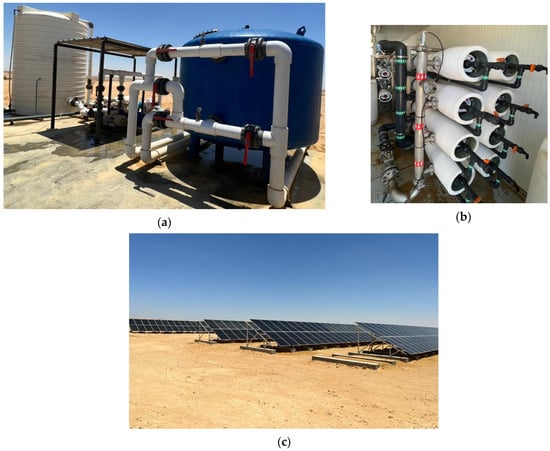 Main components of RO desalination plant: (a) tanks and pumps, (b) membranes, and (c) solar cells.