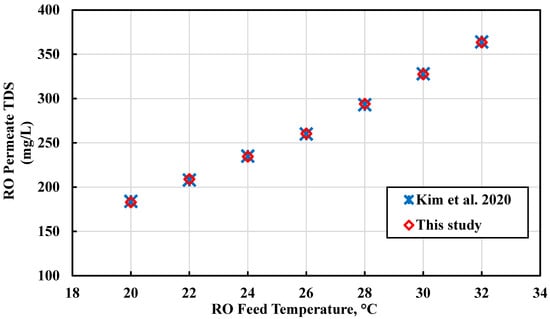 By comparing the projected findings with the existing data in the literature for the same system geometry, boundary conditions, and material parameters, preliminary tests were carried out to validate the LG Chem program (Q+ projection software v2.4). Before continuing, such comparisons thoroughly assess the dependability and accuracy of the used software. As demonstrated in Figure 5, the results of the LG Chem program (Q+ projection software v2.4) verification were compared with the comparable results of [], as shown in Figure 5. They used the LG software (South Korean company LG Water Solutions, a division of LG Chem, Seoul, Republic of Korea) and the modeling tool MATLAB R2018b to investigate the performance of an RO train with a 10,000 m3/d capacity made up of 120 pressure vessels and 7 membrane elements per pressure vessel. Figure 5 illustrates a good agreement between the presented predicted data and those numerically given in [].