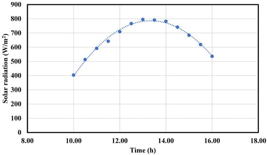 The main source of energy used in this study is solar energy. Hence, readings for solar radiation were performed from 10 a.m. to 4 p.m. (16:00), and readings were taken every 30 min. The measurements are made using a digital solar power meter. Figure 6 shows the solar radiation values during the day. Solar radiation was recorded in May 2023. The tested system is located in Cairo, Egypt, where the latitude and longitude are 30.0444° N and 31.2357° E, respectively. Solar radiation started at 404 W/m2. The solar radiation increased gradually to reach the maximum value of 795 W/m2 at 13:00. Then, the solar radiation reduced gradually to 536 W/m2.
