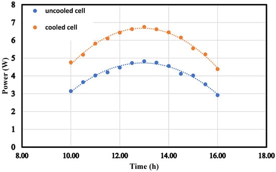 The main aim of using solar cells is to generate electricity. The electrical power is calculated based on Equation (2). In Equation (2), output voltage and output current are the basis for calculating power. The output voltage and output current are measured using a digital multimeter. There was a variable-load resistor circuit used to obtain different values of power. The maximum power was expressed in this study. Electrical power for both cases of cooled and uncooled solar cells is shown in Figure 7. Electrical power is given throughout the day every 30 min for uncooled solar cells; the electrical power increased from 3.14 W at 10:00 a.m. to 4.82 W at 1:00 p.m. However, the power decreased after that to 2.91 W at 4:00 p.m. The cooled cell produces 4.76 W of electrical power at 10:00 a.m. The maximum electrical power gain was 6.75 W at 1:00 p.m. That value declined to 4.38 W at 4:00 p.m.