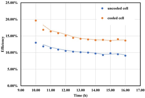 Electrical efficiency is the ratio of the electrical power generated by the solar cells to the available solar energy incident on the cells. The incident energy on a solar cell is the multiplication of solar radiation that comes from the sun at a certain time perpendicular to the wet area of the cell. The two cells used in this study have the same wet area of 0.2 × 0.3 m2. The electrical power input from sun radiation is given by Equation (1), while the electrical efficiency of solar PV cells is given by Equation (3). The electrical efficiencies of the solar PV cells for both cooled and uncooled solar cells throughout the day are shown in Figure 8. The efficiency of the uncooled cell is 12.97% at 10:00 am. The efficiency decreased gradually during the day to 9.07% at 4:00 p.m. For the cooled solar cell, the maximum efficiency is 19.46%, while the minimum efficiency is 13.26% at 4:00 p.m.