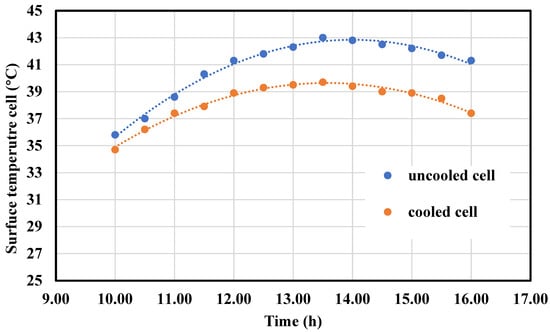 Cell surface temperature has a remarkable effect on the performance of solar PV cells. As the cell temperature increases, the electrical energy produced decreases. Solar cell temperatures for cooled and uncooled cells throughout the day are shown in Figure 9. Table 4 shows the ratio of decreasing solar cell surface temperature for cooled and uncooled solar cells. The results showed that the temperature of the uncooled cells started at 35.8 at 10:00 a.m. As the solar radiation and ambient temperature increase from 10:00 a.m. to 1:30 p.m., the cell surface temperature rises. After 1:30 p.m., the solar radiation and ambient temperature go down, so the cell surface temperature drops. The cooled solar cell surface temperature is always less than the uncooled cell temperature as the water duct absorbs heat from the cell surface. The designed duct helps to reduce the cell temperature with a ratio of not less than 2.16%. The maximum decrease in cell surface temperature reached 9.44%.