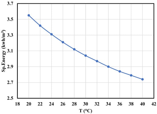 Specific energy versus feed temperature for simulated reverse-osmosis system.