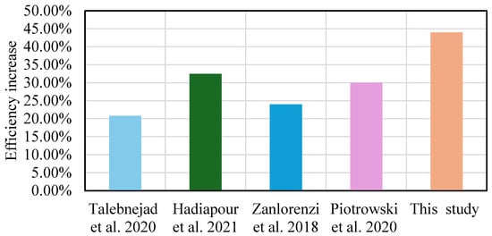 Making comparisons with previous work ensures progress throughout this study. As efficiency increase is the main goal of researchers, the comparison is held about the efficiency growth. Figure 13 shows the efficiency increase in different research papers with several techniques. What matters in this comparison is that the chosen literature [,,,] focuses on a comparable idea in which traditional photovoltaic systems are used, and water serves as the cooling fluid. The average increase in efficiency in this study reached 44%, compared to 20.8% reported by Talebnejad et al. [], 32.5% by Hadiapour et al. [], 30% by Piotrowski et al. [], and 24% by Zanlorenzi et al. []. Based on that, the presented method is a good and efficient cooling method. The increase in efficiency means that more electrical power is produced, which reduces the cost of power for operation. Figure 14 shows a comparison between this study, Shafaghat et al. [], and Armendáriz-Ontiveros et al. [] from the point of the reduction in specific energy consumption in the RO system. It shows that this study helps to reduce the energy consumption in the RO system by 3.2%, which is the same result for Shafaghat et al. [], while Armendáriz-Ontiveros et al. [] reduced it by only 2.5%. This indicates that this work has significant potential, as it reduces the energy consumed in the RO system.