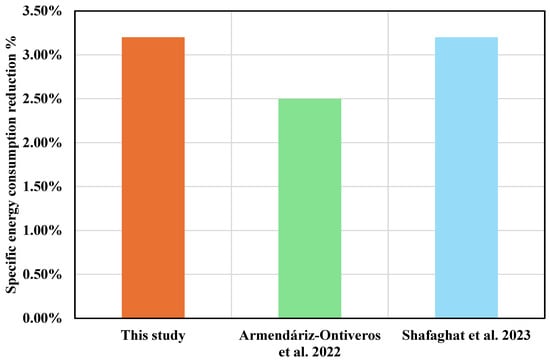 Specific energy consumption reduction as a comparison with previous studies [,].