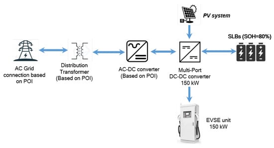 The DCFC station considered in this work includes SLBs and PV systems connected with a low-power bidirectional connection to the grid (point of interconnection or POI). Further, a 150 kW charging station is considered as an example; however, this architecture design can be extended to various power levels of DCFC stations. The proposed architecture is an evolution of the concept proposed in [,]. Figure 1 shows the architecture of the proposed DCFC station with its subcomponents and grid interface. The SLBs are connected to the grid using a secondary-distribution-level transformer and a bidirectional AC-DC converter with a maximum power connection from the grid rating POI. The distribution transformer is not considered to be part of the DCFC station when the power of the POI is lower than 120 kW, as defined by []. A bidirectional DC-DC converter, rated up to the maximum power of EVs charging, is located on the other side of the SLBs and connects the batteries to the EVs and PV system. The PV is capable of providing power through the DC-DC converters. However, the SLB and grid can have bidirectional power flow. The bidirectional flow with the grid enables additional PV power, more than the station’s self-consumption, to be sent back to the grid (according to the net metering rules []). On the EV side, the connection is made using an electric vehicle supply unit (EVSE) and unidirectional power flow. The vehicle-to-grid (V2G) capability is not considered for this study.
