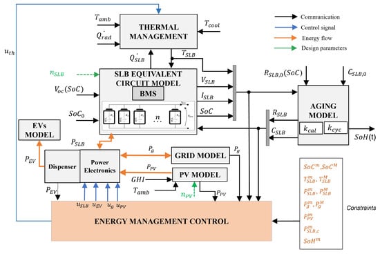 An energy management controller (EMC) was developed to prioritize the charging power availability for EV users and maintain the battery’s state of charge (SOC) within safe operating ranges. The energy required by the EVs can be delivered by the stored energy in the SLBs. Additionally, the remaining energy requirement of the EVs can be supplied by two sources, the PV and the grid. Using SLBs as the direct supply of power reduces the power dependence of the EVs on the grid. Further, the SLBs can be charged using the sources of PVs and the grid. The proportion of the power provided by either of the sources is dependent on the availability of solar energy.
