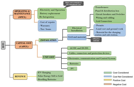 In this subsection, the cost of ownership of the EV DCFC station is evaluated and the economic value of the station is assessed through net present value (NPV) method. The breakdown of the cost structure of owning, maintaining and operating a DCFC station is considered for both the traditional and proposed station models, and these are later compared in Section 4. The costs can be categorized as capital cost (CAPEX), operating cost (OPEX) and revenue. The descriptions of components for the DCFC costs are shown in Figure 3, which includes all major cost components of the proposed DCFC station.