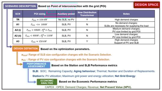 Then, Section 3 presents a design space exploration technique to optimize the DERs (PV and SLB) for different grid interconnection power levels (). For different , configurations of battery and PV systems are modeled and assessed in terms of performance and economics to select the optimal configuration. Then, the optimized solutions are compared with a traditional DCFC station with no DERs.