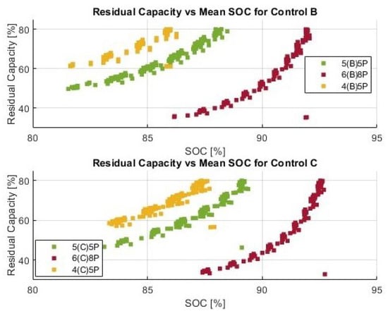The battery pack model includes electrical, thermal and degradation performance, and it was calibrated experimentally using a Ford Focus EV 2012. The aging method estimates the capacity and internal resistance of the batteries based on the cycle and calendar life using the realistic operating conditions of the battery estimated by the battery electro-thermal model. A thermal management system (TMS) model emulates a liquid cooling system and related control. The battery model was incorporated with a battery management system (BMS) model to keep the battery’s parameters in the safe operating region (voltage, current, temperature, state-of-charge limits) []. TMS and BMS were calibrated experimentally using a Ford Focus EV 2012. The battery capacity and internal resistance are degraded overtime on the basis of the current, state of charge and temperature of operation. The model used in this work includes both calendar and cycling aging and is inspired by the empirical aging model reported in []. The PV model is based on real solar irradiation and weather data from Columbus, Ohio, in the year 2020 [], and the PV panel used is a BP 3 SERIES 235 Watt []. The EV model acts as a load when EVs are present, while the power converter model provides efficiency based on system power and voltage. All the power converters are modeled using an efficiency map as a function of the processed power. The EV load was modeled as a series of pulses distributed in time and calibrated using field data, as developed in []. The grid model outputs the power based on the request from the energy management controller (EMC). The grid’s initial boundary conditions are set up to maintain the system parameters within defined ranges of several predetermined scenarios.