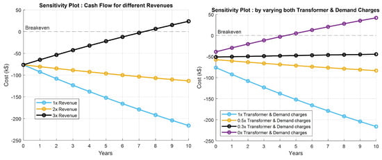 The revenues have three contributors, the earnings from EV charging, the earnings from selling the batteries after the end of the project with the energy capacity remaining and finally the earnings from solar renewable credits (SRECs) for the extra energy produced from PVs and sold to the grid (in compliance with net metering rules of Ohio []). The SREC values are based on locational marginal price (LMP) in real cases and change dynamically like a stock market. Hence for simplicity, an average value was considered from Ohio’s history of SREC prices over a year [,].