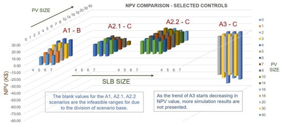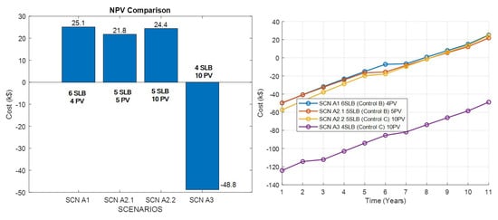 The relations of unit cost and the total cost values are shown below in Table 7. The variables with E denote the energy, and P is the power. The superscript M is the maximum value. The variable is the energy capacity of each pack, which is 23 kWh, and is the maximum energy capacity of all SLB packs together (based on the number of SLB packs ) on which the total cost of SLB is based. Similarly, is the maximum power for a single PV module, and the total cost of PV depends on the total number of modules used . The is the replacement index of the SLBs, defining the number of replacements.