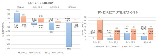 To maximize the station’s performance and the economic benefits of the proposed architecture, the interaction of the DERs (SLBs and PVs) and the grid needs to be optimally selected and optimized. A suboptimal configuration could lead to oversizing or undersizing of the sources or DERs, causing economic and energy loss. Design parameters for this work are chosen as the sizes of SLBs () and PVs () and the grid interconnection power ().