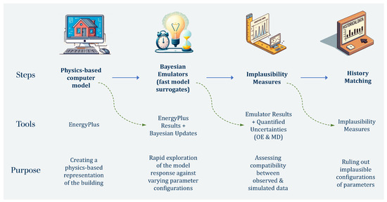 Emulation is developed under Bayesian principles, which provide a natural framework to handle uncertainties. In the context of model calibration, key sources of uncertainties that come into play include (i) the intrinsic ability of the model to simulate the target process (model discrepancy); (ii) the accuracy of the observations used to calibrate the model (observational error). The inability of a schedule-driven occupancy template to represent the stochastic behavior of occupants is an example of model discrepancy, while temperature sensor errors are an example of observational error. To deal coherently with these and other sources of uncertainty before and during model calibration, we discuss and advocate here for the use of an iterative procedure, known as history matching. History matching (HM) is used in conjunction with emulation to quickly evaluate the simulator’s response across the full region of model parameter configurations, and discard those input configurations that—in light of quantified uncertainties—cannot match the observed data. The procedure is performed iteratively, sequentially refocusing on smaller regions of parameter configurations that have not yet been ruled out.