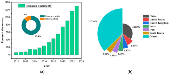Statistics of (a) year-wise research publications and (b) country-wise distribution of research documents in sCO2 power systems for the period of 2010–2023 (Source: Elaboration from Scopus database).