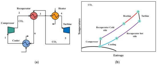 (a) Simple sCO2 Brayton cycle with recuperator; (b) Thermodynamic cycle [17].