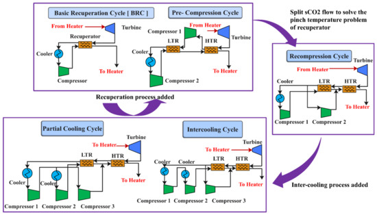 The simple power cycle is inefficient due to the energy lost to the environment as waste heat. To utilize this waste heat, a regenerative component (recuperator) is added to the simple power cycle. In general, the basic recuperated cycle is the foundation of all the advanced power cycles, and it is used as a reference layout for all the complex layouts. Figure 6 illustrates the improvement paths of the sCO2 Brayton cycle. Although a simple recuperated cycle is capable of recovering a substantial quantity of waste heat, its operational capabilities are constrained by the pinch point issue (i.e., the pinch point refers to the point where the temperature difference between fluids is the smallest). By utilizing the recompression cycle, the pinch point effect is circumvented. In this scenario, the recuperator is divided into two parts (low-temperature recuperators and high-temperature recuperators), with a compressor sandwiched between the two. By decreasing the high-pressure stream’s mass flow rate, the recompression cycle reduces the variation in the heat capacity. Another method for minimizing the pinch point effect and increasing the recovery heat is to use the precompression cycle. It is accomplished by increasing the pressure of a low-pressure flow stream, which reduces the difference between the hot and cold heat capacity. The turbine work increases during the recompression cycle with precompression, because sCO2 expands to a subcritical state from the turbine outlet.