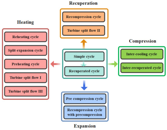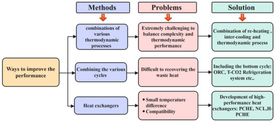 There are three primary methods to improve the sCO2 power cycle performance. The first method is to organize various combinations of the thermodynamic processes in the advanced sCO2 power cycle. The second method involves combining the various cycles with the sCO2 power cycle. The third method involves recovering waste heat from the power cycle, including efficient heat exchangers that do not interfere with the main cycle as shown in Figure 7.