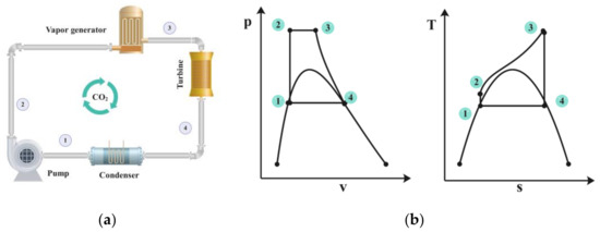In the supercritical Brayton cycle, both heat addition and heat rejection occur at a supercritical pressure, whereas only heat addition occurs at a supercritical pressure in the sCO2 Rankine cycle. In the sCO2 Rankine cycle, as shown in Figure 8a, liquid CO2 is pumped to a vapor generator and heat is added to this fluid under constant pressure. This process continues to a point where the CO2 crosses beyond its critical point. The CO2 entering the turbine is fully in the superheated vapor state. In the turbine, the superheated vapor undergoes an isentropic expansion as shown in Figure 8b. After the expansion, the CO2 is in a saturated vapor state and it is then fed to a condenser, where the heat is removed from the fluid. Saturated liquid CO2 exits the condenser under a constant pressure condition. The cycle diagram of a typical Rankine cycle is shown in Figure 8 as illustrated by the work [34], which proposes the flexibility of low-grade heat conversion.