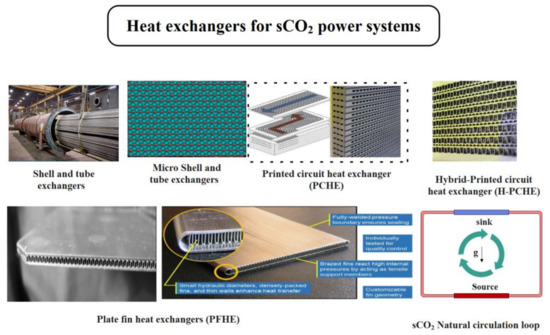 In the case of sCO2 systems, heat exchangers must be capable of withstanding pressures of at least 30 MPa and temperatures ranging from 550 °C to 750 °C. It is subject to severe thermal shock and stress. As a result, the sCO2 system employs a limited variety of heat exchangers, as illustrated in Figure 9. It includes shell-and-tube heat exchangers, printed circuit heat exchangers (PCHEs), plate fine heat exchangers (PFHEs), hybrid printed circuit heat exchangers (H-PCHEs), and supercritical natural circulation loops (SCNCLs). The recuperator is a critical element within the Brayton cycle, exerting a substantial influence on the overall efficiency of the apparatus. When a fluid reaches its pseudo-critical point, the recuperator heat transfer mechanism becomes more complex. Numerous researchers are working to optimize the designs of recuperators. Additionally, in the Brayton cycle, the sCO2 heat exchanger is commonly heated by high-temperature water [47] or other liquids [48] or gases [49]. The PCHE, shell-and-tube heat exchangers have potential applications in this field, which can handle high pressures and high temperatures [50]. Seo et al. [49] conducted a numerical analysis of tubular-type sCO2 heat exchangers for sCO2 systems. The desired outlet temperature and pressure were established at 600 °C and 200 bar, respectively, using a staggered tube array featuring counter-crossflow configurations. The thermal stress was determined to be less than the allowable limit proposed by the American Society of Mechanical Engineers (ASME), suggesting the suitability of tubular-type heat exchangers in high-temperature and high-pressure scenarios.