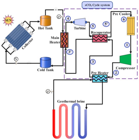 Schematic diagram of the standalone sCO2 plant for hybrid solar and geothermal power generation [102].
