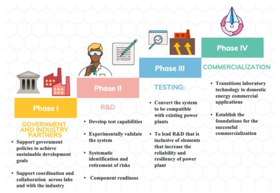The commercialization roadmap for sCO2 systems is presented in Figure 13. The incorporation of government policies into system development and collaboration with industry is the initial step in commercialization, allowing research coordination to reach its objective more quickly. The second phase consists of constructing a system facility, conducting a risk assessment, and the experimental validation of the system.