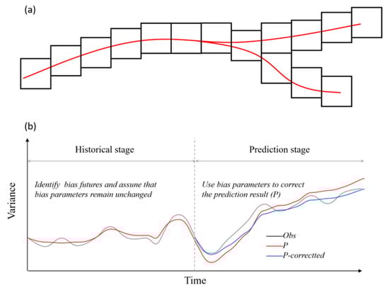 In the past, the Makkonen model was commonly used to predict overhead transmission line icing, which provides valuable insights into determining the key meteorological factors. Zhou et al. [] proposed a new approach for overhead transmission line icing prediction, and their simulations were found to be quite close to the observations. In this approach, meteorological factors such as wind speed, humidity and temperature are fully considered, and different types of terrain are also taken into account. In other words, icing thickness simulation is conducted by modeling for different micro-terrains individually. Moreover, their method [,,,] fully utilizes historical observation data by determining error parameters based on historical data and iteratively applying these parameters to future predictions, thereby enabling short-term icing simulations (Figure 1b).